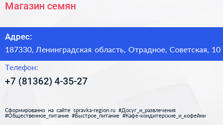 Магазин семян по адресу 187330, Ленинградская область, Отрадное, Советская, 10 в дальнейшем Организация, размещена в следующих категориях: