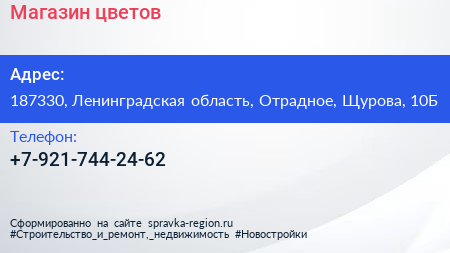 Магазин цветов по адресу 187330, Ленинградская область, Отрадное, Щурова, 10Б в дальнейшем Организация, размещена в следующих категориях: