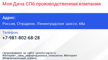 Моя Дача СПб, производственная компания по адресу 68, Ленинградское шоссе, Усть-Тосно, Отрадненское городское поселение, Кировский район, Ленинградская область, Северо-Западный федеральный округ, 187330, Россия в дальнейшем Организация, размещена в следующих категориях: