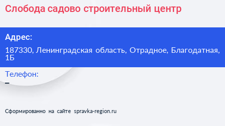 Слобода, садово-строительный центр по адресу 187330, Ленинградская область, Отрадное, Благодатная, 1Б в дальнейшем Организация, размещена в следующих категориях: