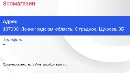 Зоомагазин по адресу 187330, Ленинградская область, Отрадное, Щурова, 3Б в дальнейшем Организация, размещена в следующих категориях: