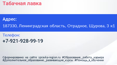 Табачная лавка по адресу 187330, Ленинградская область, Отрадное, Щурова, 3 к1 в дальнейшем Организация, размещена в следующих категориях: