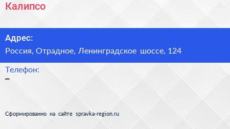 Калипсо по адресу Ленинградское шоссе, Усть-Тосно, Отрадненское городское поселение, Кировский район, Ленинградская область, Северо-Западный федеральный округ, 188683, Россия в дальнейшем Организация, размещена в следующих категориях: