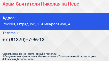 Храм Святителя Николая на Неве по адресу Церковь Николая Чудотворца, 5, посёлок им. Свердлова, посёлок имени Свердлова, Свердловское городское поселение, Всеволожский район, Ленинградская область, Северо-Западный федеральный округ, 188683, Россия в дальнейшем Организация, размещена в следующих категориях: