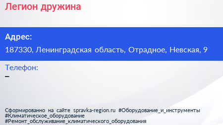 Легион, дружина по адресу 187330, Ленинградская область, Отрадное, Невская, 9 в дальнейшем Организация, размещена в следующих категориях: