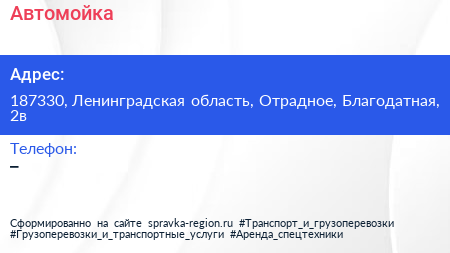 Автомойка по адресу 187330, Ленинградская область, Отрадное, Благодатная, 2в в дальнейшем Организация, размещена в следующих категориях: