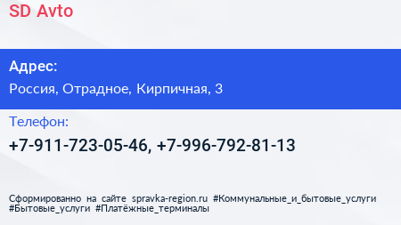SD-Avto по адресу Хороший Сервис, 5, Кирпичная улица, Строитель, Отрадненское городское поселение, Кировский район, Ленинградская область, Северо-Западный федеральный округ, 187330, Россия в дальнейшем Организация, размещена в следующих категориях: