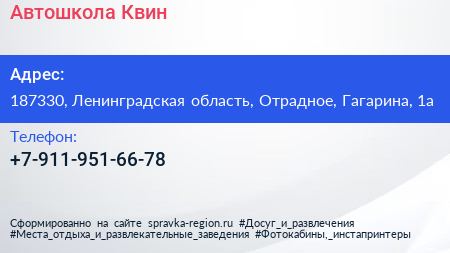 Автошкола Квин по адресу 187330, Ленинградская область, Отрадное, Гагарина, 1а в дальнейшем Организация, размещена в следующих категориях: