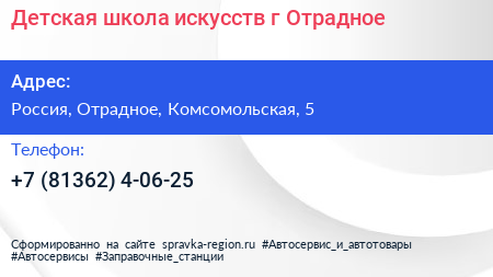 Детская школа искусств, г. Отрадное по адресу Детская школа искусств (муз. отд.), 5, Комсомольская улица, Отрадненское городское поселение, Кировский район, Ленинградская область, Северо-Западный федеральный округ, 187330, Россия в дальнейшем Организация, размещена в следующих категориях: