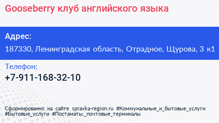 Gooseberry, клуб английского языка по адресу 187330, Ленинградская область, Отрадное, Щурова, 3 к1 в дальнейшем Организация, размещена в следующих категориях: