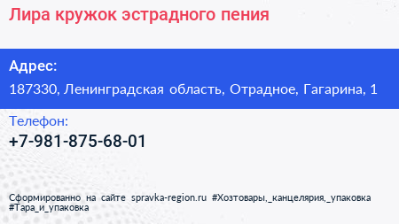 Лира, кружок эстрадного пения по адресу 187330, Ленинградская область, Отрадное, Гагарина, 1 в дальнейшем Организация, размещена в следующих категориях: