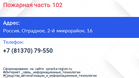 Пожарная часть №102 по адресу 41К-312, Старая Дача, посёлок имени Свердлова, Свердловское городское поселение, Всеволожский район, Ленинградская область, Северо-Западный федеральный округ, 188683, Россия в дальнейшем Организация, размещена в следующих категориях: