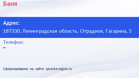 Баня по адресу 187330, Ленинградская область, Отрадное, Гагарина, 5 в дальнейшем Организация, размещена в следующих категориях: