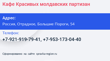 Кафе Красивых молдавских партизан по адресу Продукты, 54, Большие Пороги, Свердловское городское поселение, Всеволожский район, Ленинградская область, Северо-Западный федеральный округ, 188685, Россия в дальнейшем Организация, размещена в следующих категориях: