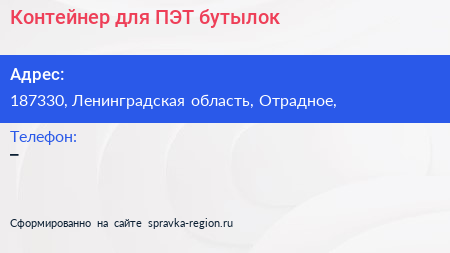 Контейнер для ПЭТ-бутылок по адресу 187330, Ленинградская область, Отрадное, в дальнейшем Организация, размещена в следующих категориях: