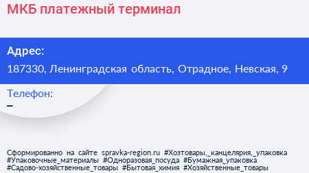 МКБ, платежный терминал по адресу 187330, Ленинградская область, Отрадное, Невская, 9 в дальнейшем Организация, размещена в следующих категориях: