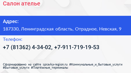 Салон-ателье по адресу 187330, Ленинградская область, Отрадное, Невская, 9 в дальнейшем Организация, размещена в следующих категориях: