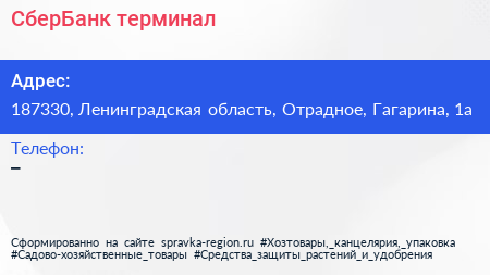 СберБанк, терминал по адресу 187330, Ленинградская область, Отрадное, Гагарина, 1а в дальнейшем Организация, размещена в следующих категориях: