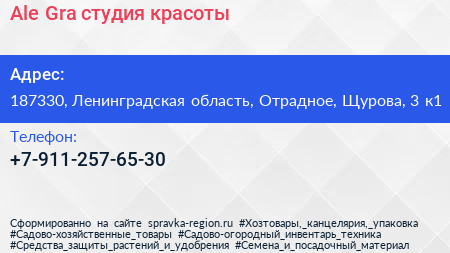 Ale Gra, студия красоты по адресу 187330, Ленинградская область, Отрадное, Щурова, 3 к1 в дальнейшем Организация, размещена в следующих категориях: