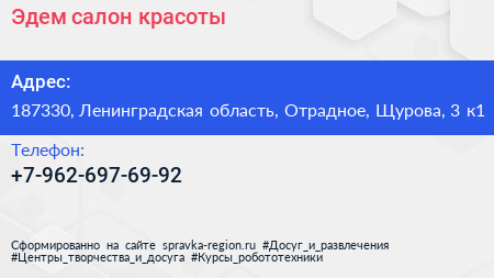 Эдем, салон красоты по адресу 187330, Ленинградская область, Отрадное, Щурова, 3 к1 в дальнейшем Организация, размещена в следующих категориях: