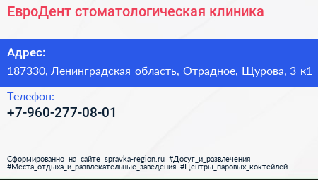 ЕвроДент, стоматологическая клиника по адресу 187330, Ленинградская область, Отрадное, Щурова, 3 к1 в дальнейшем Организация, размещена в следующих категориях: