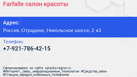 Farfalle, салон красоты по адресу Регион 47, 2 к3, Никольское шоссе, Отрадненское городское поселение, Кировский район, Ленинградская область, Северо-Западный федеральный округ, 187330, Россия в дальнейшем Организация, размещена в следующих категориях: