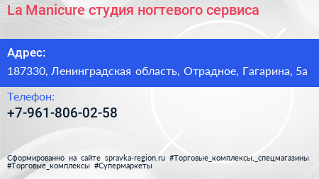 La Manicure, студия ногтевого сервиса по адресу 187330, Ленинградская область, Отрадное, Гагарина, 5а в дальнейшем Организация, размещена в следующих категориях: