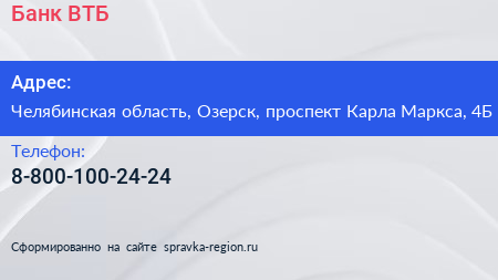 Банк ВТБ по адресу Челябинская область, Озерск, проспект Карла Маркса, 4Б в дальнейшем Организация, размещена в следующих категориях: