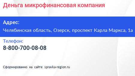 Деньга, микрофинансовая компания по адресу Челябинская область, Озерск, проспект Карла Маркса, 1а в дальнейшем Организация, размещена в следующих категориях: