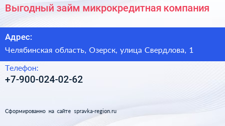 Выгодный займ, микрокредитная компания по адресу Челябинская область, Озерск, улица Свердлова, 1 в дальнейшем Организация, размещена в следующих категориях: