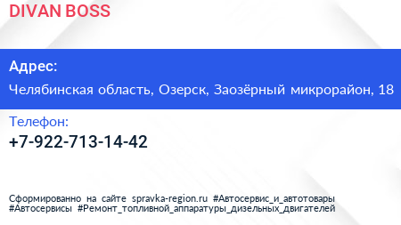 DIVAN BOSS по адресу Челябинская область, Озерск, Заозёрный микрорайон, 18 в дальнейшем Организация, размещена в следующих категориях: