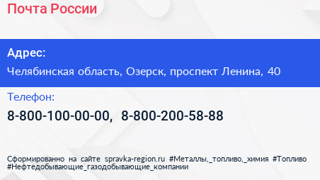 Почта России по адресу Челябинская область, Озерск, проспект Ленина, 40 в дальнейшем Организация, размещена в следующих категориях:
