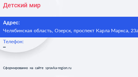Детский мир по адресу Челябинская область, Озерск, проспект Карла Маркса, 23а в дальнейшем Организация, размещена в следующих категориях: