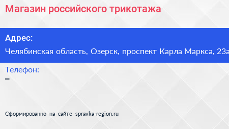 Магазин российского трикотажа по адресу Челябинская область, Озерск, проспект Карла Маркса, 23а в дальнейшем Организация, размещена в следующих категориях: