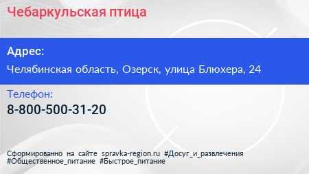 Чебаркульская птица по адресу Челябинская область, Озерск, улица Блюхера, 24 в дальнейшем Организация, размещена в следующих категориях: