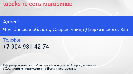 tabaks.ru, сеть магазинов по адресу Челябинская область, Озерск, улица Дзержинского, 35а в дальнейшем Организация, размещена в следующих категориях: