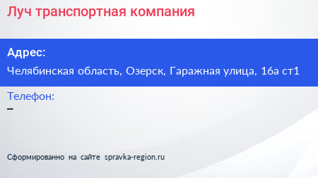 Луч, транспортная компания по адресу Челябинская область, Озерск, Гаражная улица, 16а ст1 в дальнейшем Организация, размещена в следующих категориях: