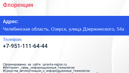 Флоренция по адресу Челябинская область, Озерск, улица Дзержинского, 54а в дальнейшем Организация, размещена в следующих категориях: