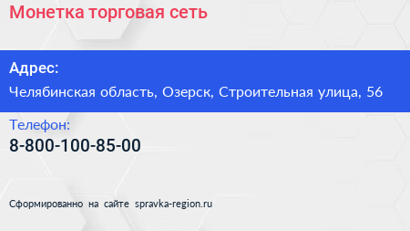 Монетка, торговая сеть по адресу Челябинская область, Озерск, Строительная улица, 56 в дальнейшем Организация, размещена в следующих категориях: