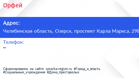 Орфей по адресу Челябинская область, Озерск, проспект Карла Маркса, 29Б в дальнейшем Организация, размещена в следующих категориях: