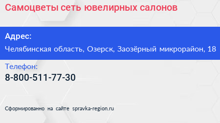 Самоцветы, сеть ювелирных салонов по адресу Челябинская область, Озерск, Заозёрный микрорайон, 18 в дальнейшем Организация, размещена в следующих категориях: