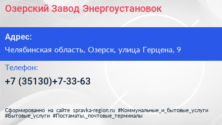 Озерский Завод Энергоустановок по адресу Челябинская область, Озерск, улица Герцена, 9 в дальнейшем Организация, размещена в следующих категориях:
