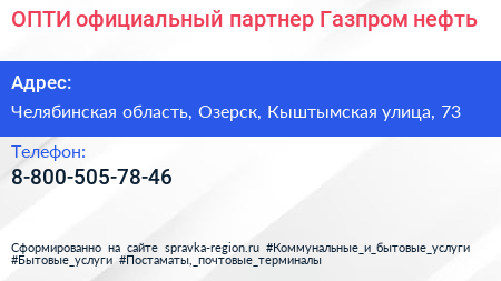 ОПТИ, официальный партнер Газпром нефть по адресу Челябинская область, Озерск, Кыштымская улица, 73 в дальнейшем Организация, размещена в следующих категориях: