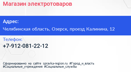 Магазин электротоваров по адресу Челябинская область, Озерск, проезд Калинина, 12 в дальнейшем Организация, размещена в следующих категориях: