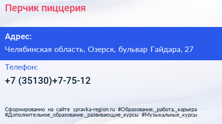 Перчик, пиццерия по адресу Челябинская область, Озерск, бульвар Гайдара, 27 в дальнейшем Организация, размещена в следующих категориях:
