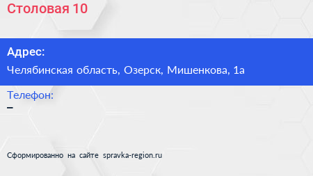Столовая №10 по адресу Челябинская область, Озерск, Мишенкова, 1а в дальнейшем Организация, размещена в следующих категориях: