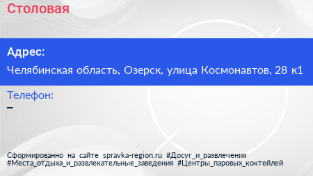 Столовая по адресу Челябинская область, Озерск, улица Космонавтов, 28 к1 в дальнейшем Организация, размещена в следующих категориях: