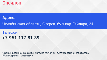 Эпсилон по адресу Челябинская область, Озерск, бульвар Гайдара, 24 в дальнейшем Организация, размещена в следующих категориях: