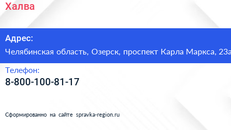 Халва по адресу Челябинская область, Озерск, проспект Карла Маркса, 23а в дальнейшем Организация, размещена в следующих категориях: