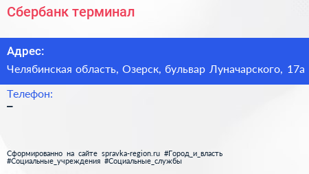 Сбербанк, терминал по адресу Челябинская область, Озерск, бульвар Луначарского, 17а в дальнейшем Организация, размещена в следующих категориях: